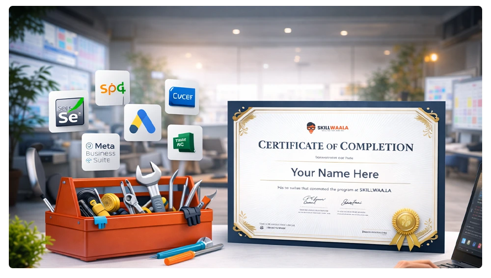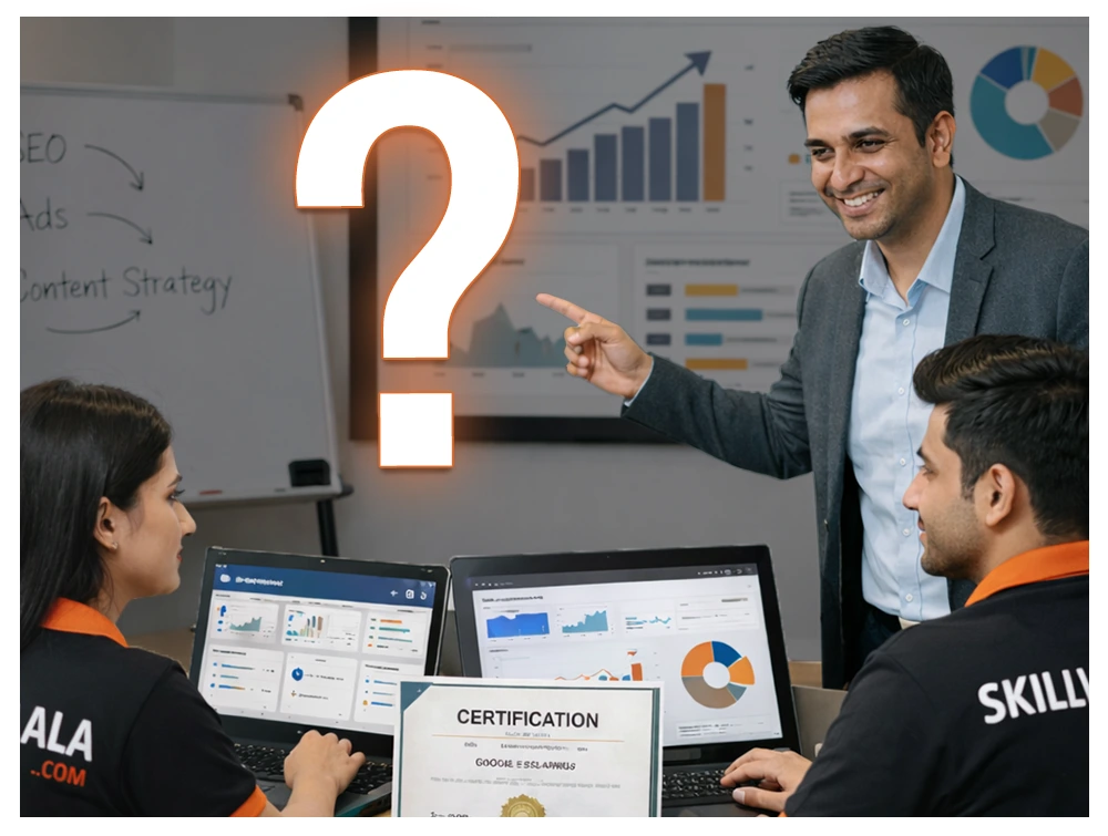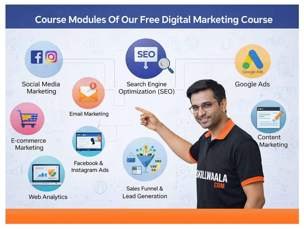 Our free digital marketing course with certification covers everything from SEO, Google Ads, Meta Ads, and SMO to content marketing and analytics. Whether you are a student, job-seeker, or working professional, Skillwaala brings you hands-on training with real-world case studies.